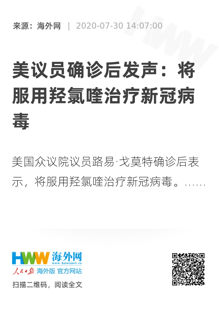 海外网7月30日电 美国众议院议员路易·戈莫特(Louie Gohmert)新冠病毒检测呈阳性后发声,称将服用羟氯喹治疗新冠病毒。