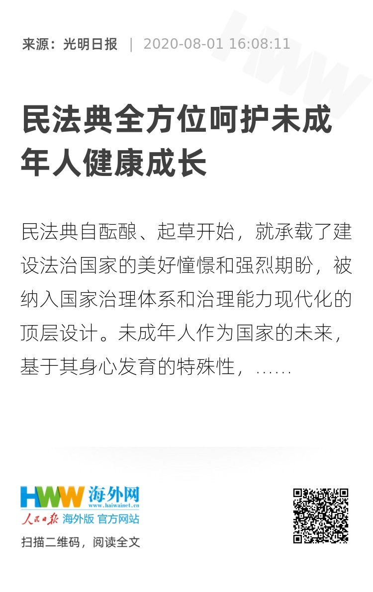民法典自酝酿、起草开始,就承载了建设法治国家的美好憧憬和强烈期盼,被纳入国家治理体系和治理能力现代化的顶层设计。未成年人作为国家的未来,基于其身心发育的特殊性,尤其需要在法治领域给予特殊关注,全方位呵护其健康成长。民法典的颁布,为构建未成年人权利保护法律体系增加了浓墨重彩的一笔。