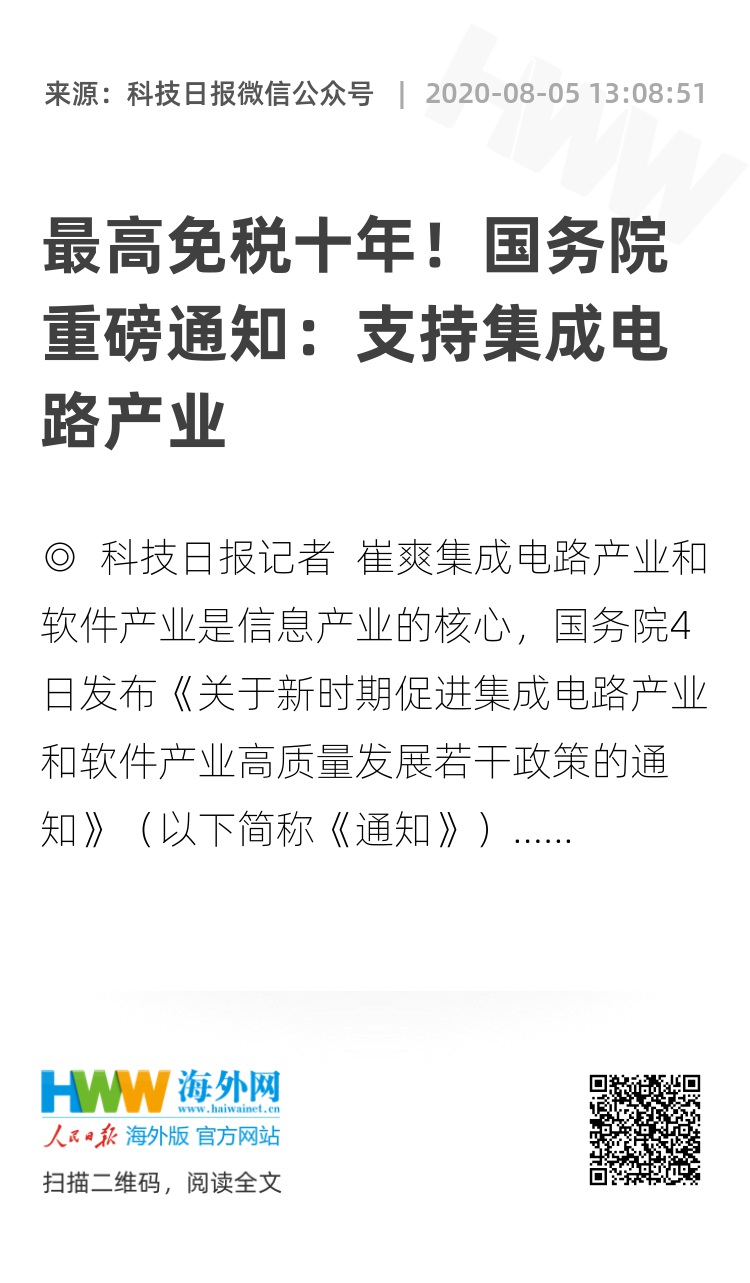 集成电路产业和软件产业是信息产业的核心,国务院4日发布《关于新时期促进集成电路产业和软件产业高质量发展若干政策的通知》(以下简称《通知》),制定出台财税、投融资、研究开发、进出口、人才、知识产权、市场应用、国际合作等八个方面政策措施,大力支持集成电路和软件产业。
