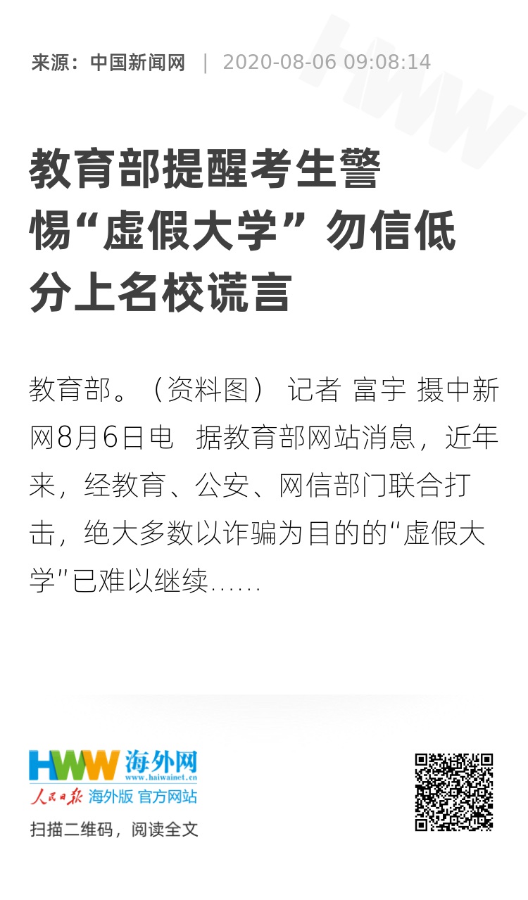 中新网8月6日电 据教育部网站消息,近年来,经教育、公安、网信部门联合打击,绝大多数以诈骗为目的的“虚假大学”已难以继续招摇撞骗,但在经济利益的诱惑下,仍有可能出现新的“虚假大学”。因此,教育部再次提醒广大考生与家长,不要相信任何“走捷径”、“低分上名校”的谎言,在志愿填报时做到: