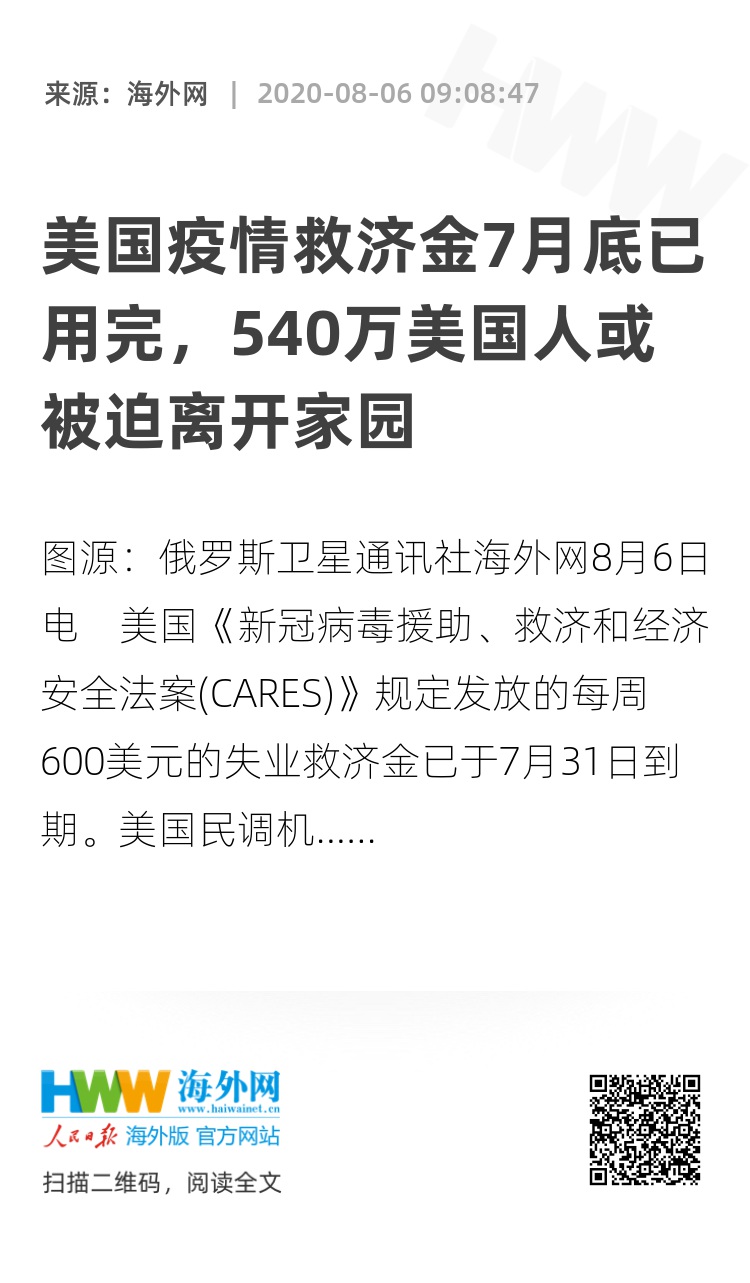 海外网8月6日电 美国《新冠病毒援助、救济和经济安全法案(CARES)》规定发放的每周600美元的失业救济金已于7月31日到期。美国民调机构8月5日一项新的分析预计,540万美国人在8月底将面临财务危机,或被迫离开家园。