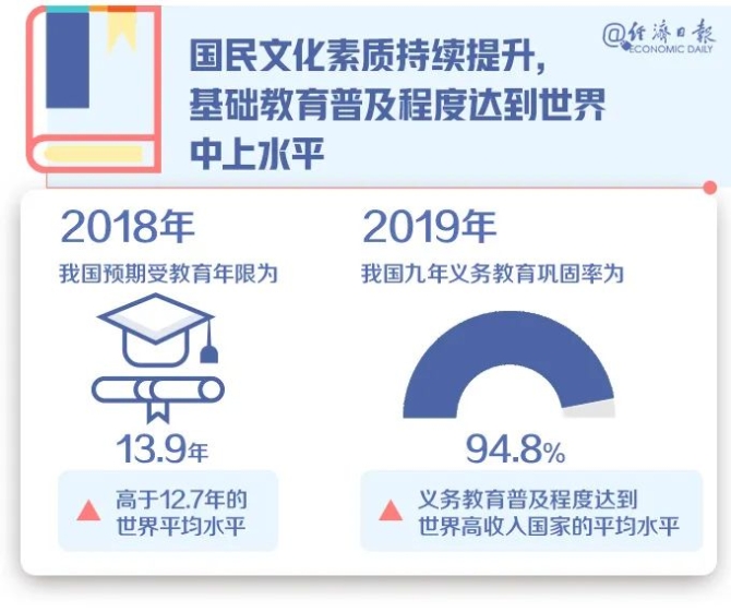 2018年,我国预期受教育年限为13.9年,高于12.7年的世界平均水平,较2000年提高4.3年,为同期提升幅度最大的国家之一。