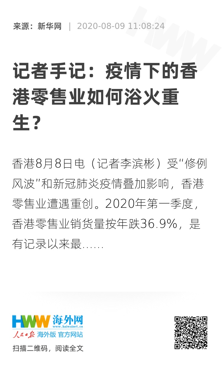 新华社香港8月8日电(记者李滨彬)受“修例风波”和新冠肺炎疫情叠加影响,香港零售业遭遇重创。2020年第一季度,香港零售业销货量按年跌36.9%,是有记录以来最大单季跌幅。面对逆境,香港本土零售商开始寻求转型突破之路。