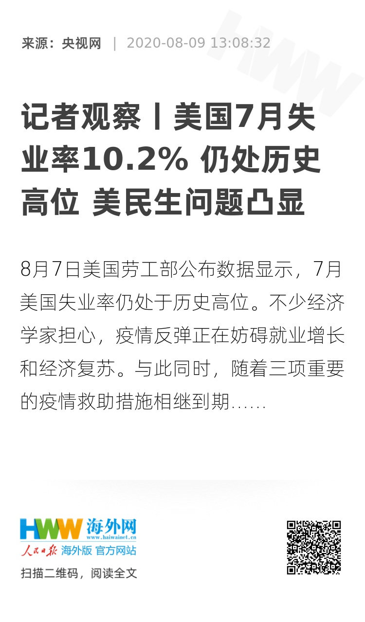 8月7日美国劳工部公布数据显示,7月美国失业率仍处于历史高位。不少经济学家担心,疫情反弹正在妨碍就业增长和经济复苏。与此同时,随着三项重要的疫情救助措施相继到期,美国社会的就业、生活、住房等民生问题日益凸显。