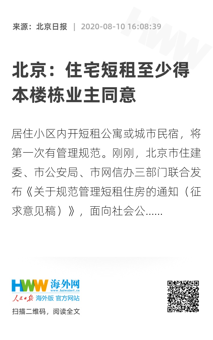 居住小区内开短租公寓或城市民宿,将第一次有管理规范。刚刚,北京市住建委、市公安局、市网信办三部门联合发布《关于规范管理短租住房的通知(征求意见稿)》,面向社会公开征求意见。征求意见稿拟明确,小区业主将住宅对外短租经营的,应符合本小区管理规约或业主大会决定;无管理规约或业主大会决定的,应当取得本栋楼内其他业主的书面同意。