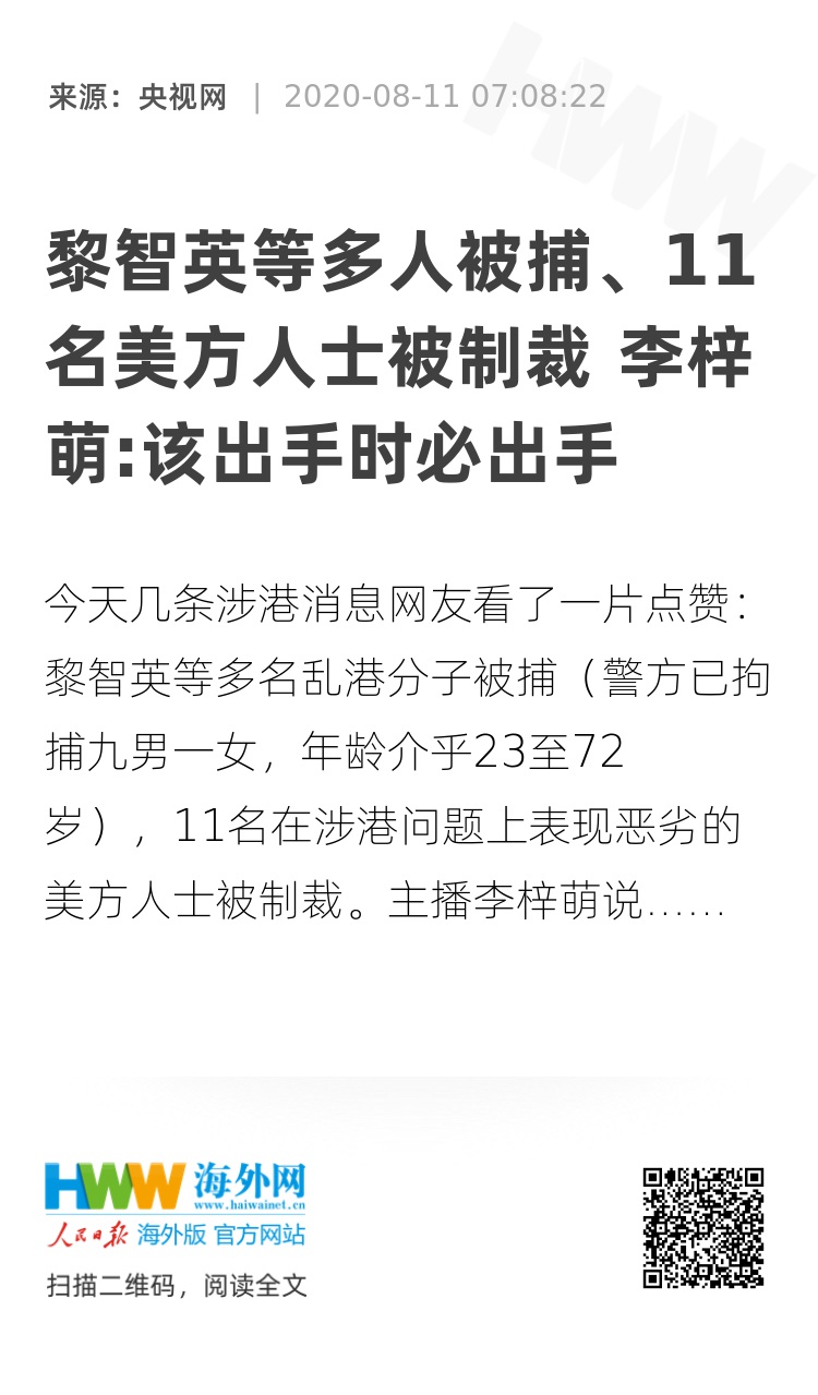 今天有几条涉港消息关注度很高,网友看了也感到相当快慰。乱港头目黎智英等人涉嫌违反香港国安法被拘捕,11名在涉港问题上表现恶劣的美方人士被制裁,联播有相关报道。