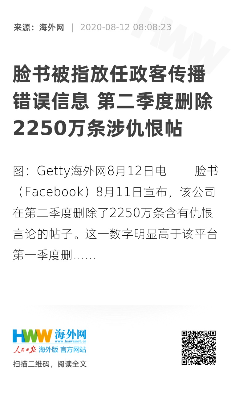 海外网8月12日电 脸书(Facebook)8月11日宣布,该公司在第二季度删除了2250万条含有仇恨言论的帖子。这一数字明显高于该平台第一季度删除的960万条。据《国会山报》8月11日报道,平台自动识别仇恨内容的比率从第一季度的不到89%上升到94.5%。由于删除量的增加,脸书在处理平台上仇恨内容方面面临的压力越来越大。