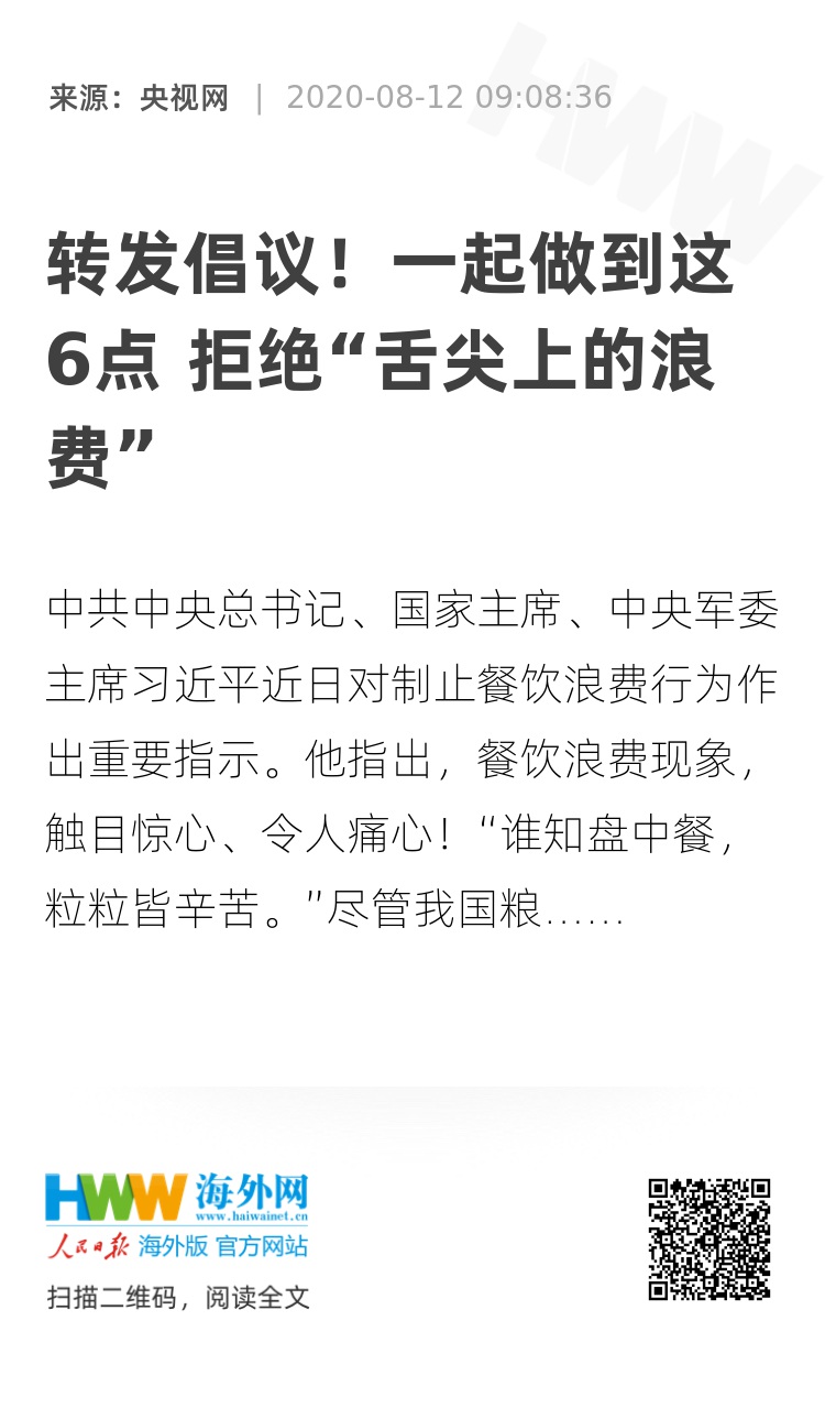 中共中央总书记、国家主席、中央军委主席习近平近日对制止餐饮浪费行为作出重要指示。他指出,餐饮浪费现象,触目惊心、令人痛心!“谁知盘中餐,粒粒皆辛苦。”尽管我国粮食生产连年丰收,对粮食安全还是始终要有危机意识,今年全球新冠肺炎疫情所带来的影响更是给我们敲响了警钟。