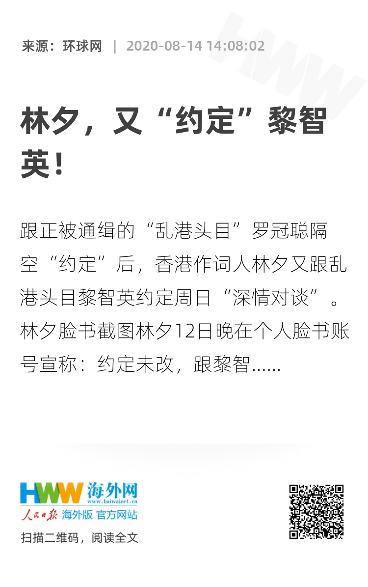香港警方8月10日早上以涉嫌违反香港国安法拘捕黎智英等人,11日凌晨1点多,林夕就跳出来,在脸书上发文支持黎智英,并称两人本来在本周六有一个对谈节目,“现在看来,希望是个不远的约定”。