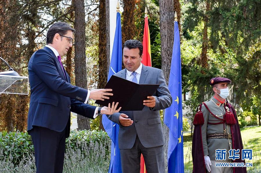 8月13日,北马其顿总统彭达罗夫斯基(左)在斯科普里授权马其顿社会民主联盟领导人扎埃夫(中)组建新一届政府。 彭达罗夫斯基当天宣布,根据北马其顿宪法及由马其顿社会民主联盟和“贝萨”运动组成的政党联盟的建议,任命扎埃夫为候任总理,并授权其组建新政府。 新华社发