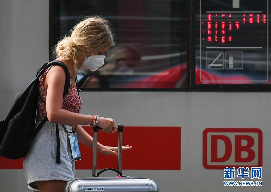 8月14日,在德国法兰克福,一名戴口罩的乘客从火车站站台走过。 新华社记者逯阳摄
