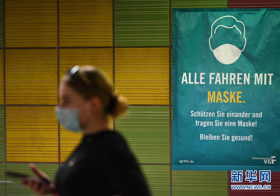 8月14日,在德国法兰克福,一张提示人们戴口罩的海报贴在地铁站内的墙上。 新华社记者逯阳摄