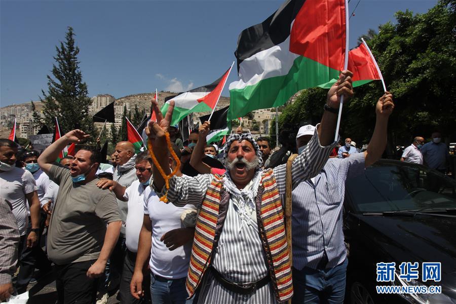 8月14日,巴勒斯坦人在约旦河西岸城市纳布卢斯抗议以色列与阿联酋达成的和平协议。 新华社发(尼达勒摄)