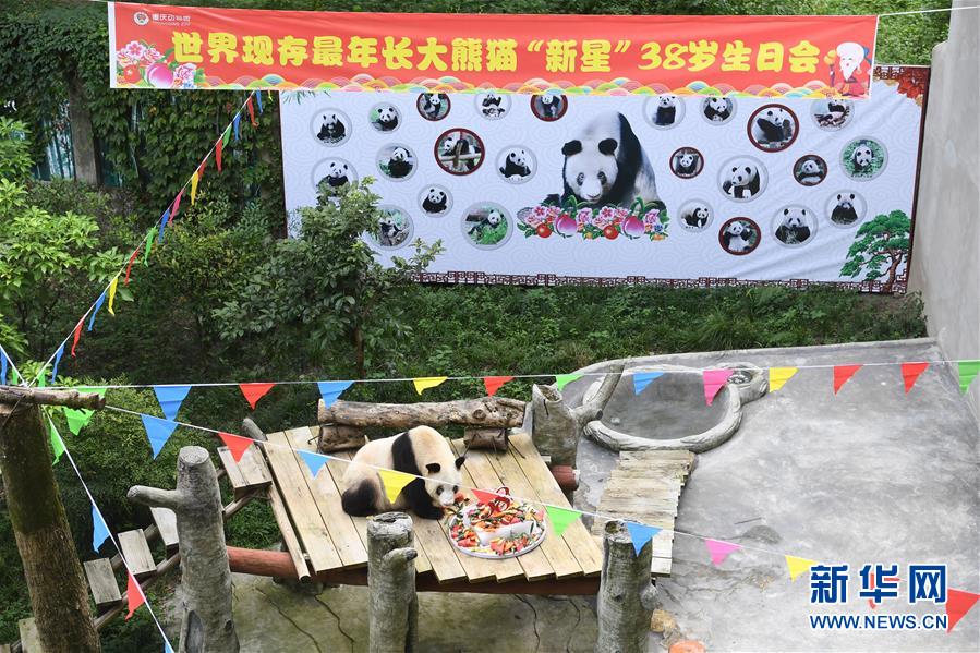 8月16日,大熊猫“新星”在38岁生日会上享用水果生日蛋糕。 当日,世界现存最年长圈养大熊猫“新星”迎来38岁生日,重庆动物园为“老寿星”举行了生日会。“新星”的年龄相当于人类的110至150岁,目前身体状况良好。 大熊猫“新星”1982年出生于四川宝兴县野外,1983年来到重庆动物园。 新华社记者 唐奕 摄