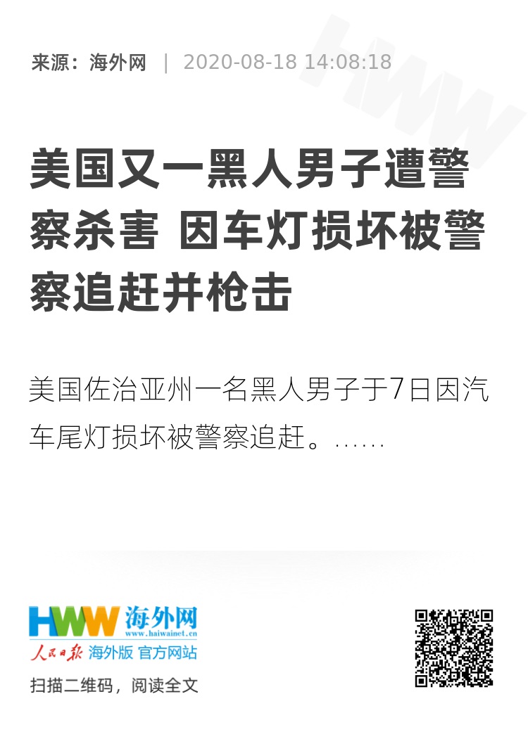 海外网8月18日电 美国佐治亚州一名黑人男子于7日因汽车尾灯损坏被警察追赶,在他的车被迫停下后,警察向他头部开枪致其死亡。涉事警察已于14日被捕。