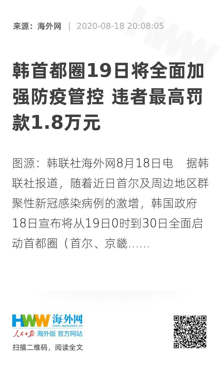 海外网8月18日电 据韩联社报道,随着近日首尔及周边地区群聚性新冠感染病例的激增,韩国政府18日宣布将从19日0时到30日全面启动首都圈(首尔、京畿道、仁川)“保持社交距离”防疫二级响应,加强防疫管控工作力度。