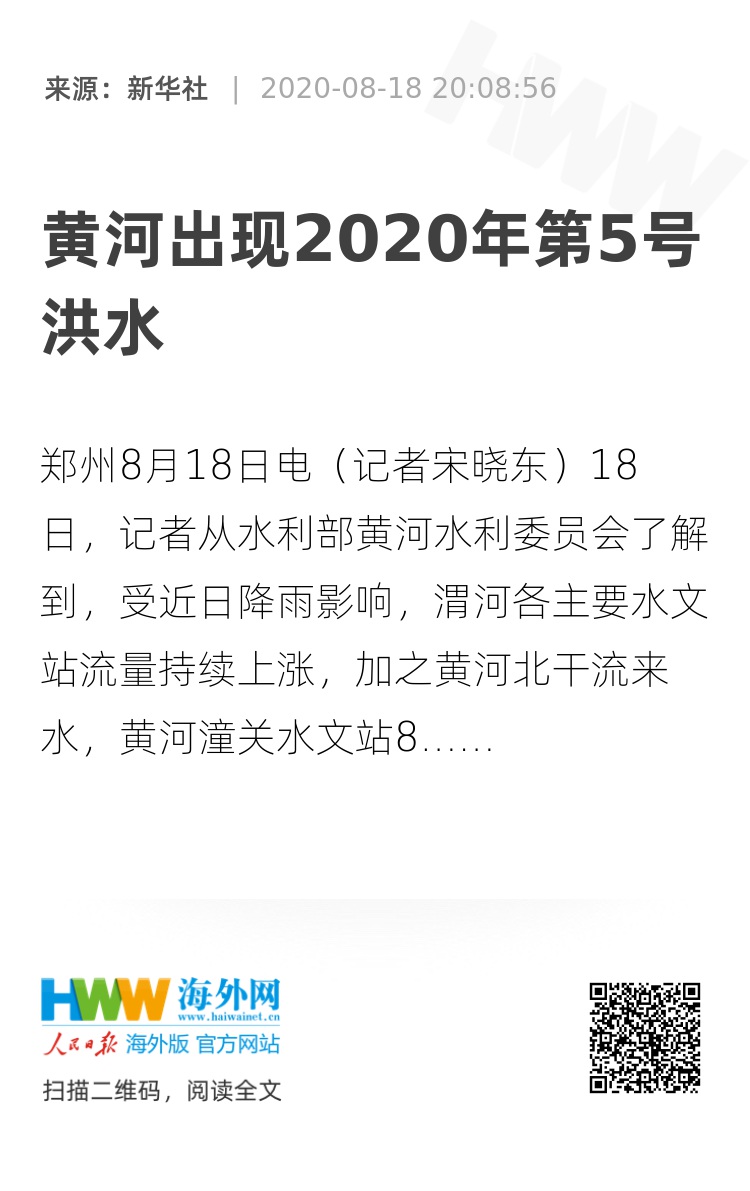 新华社郑州8月18日电(记者宋晓东)18日,记者从水利部黄河水利委员会了解到,受近日降雨影响,渭河各主要水文站流量持续上涨,加之黄河北干流来水,黄河潼关水文站8月18日5时6分出现5050立方米每秒的流量,为黄河2020年第5号洪水。