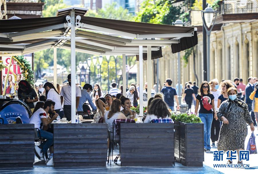 8月18日,人们在阿塞拜疆首都巴库的露天餐饮场所用餐。 根据阿塞拜疆政府规定,自18日起,包括巴库在内的执行强制隔离制度的城市和地区允许露天餐饮场所恢复营业。 新华社发(巴巴耶夫摄)