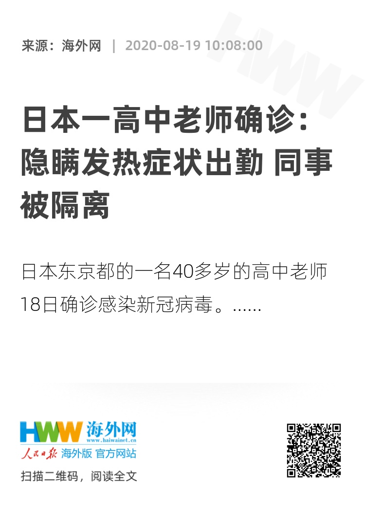 海外网8月19日电 日本东京都一名40多岁的高中老师18日确诊感染新冠病毒,因他未将接受检测一事报告给校方,并在结果出来前擅自出勤,校长对他提出了严重警告,一名与他有过接触的同事也因此接受隔离。