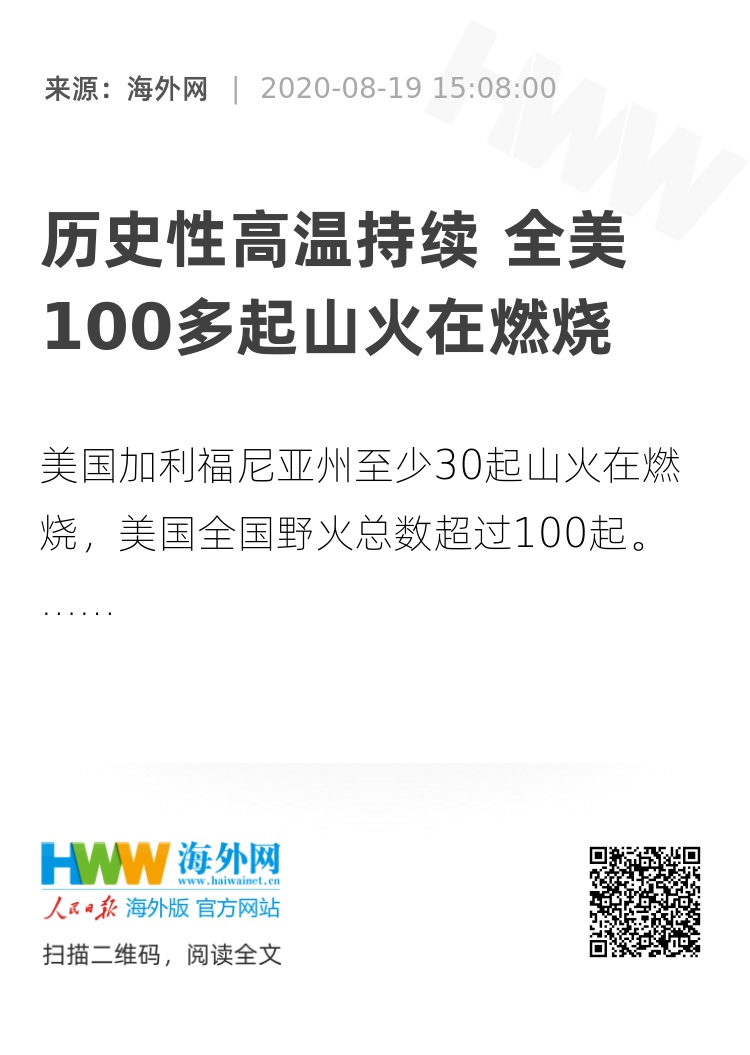 海外网8月19日电 由于地面干燥和频繁的雷暴天气,美国西部地区又发生了多起新的山火。目前,仅在加利福尼亚州就有至少30起山火在燃烧,这使得美国全国野火总数超过100起。