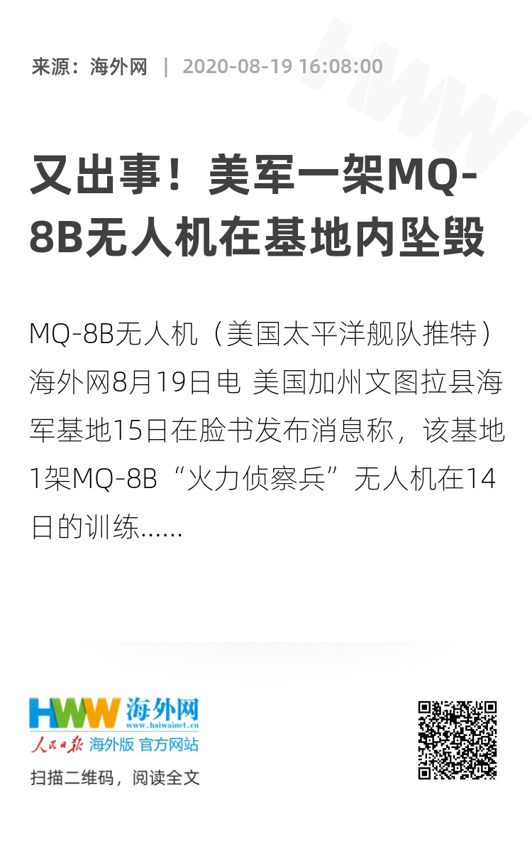 海外网8月19日电 美国加州文图拉县海军基地15日在脸书发布消息称,该基地1架MQ-8B“火力侦察兵”无人机在14日的训练中,撞上建筑物意外坠毁。