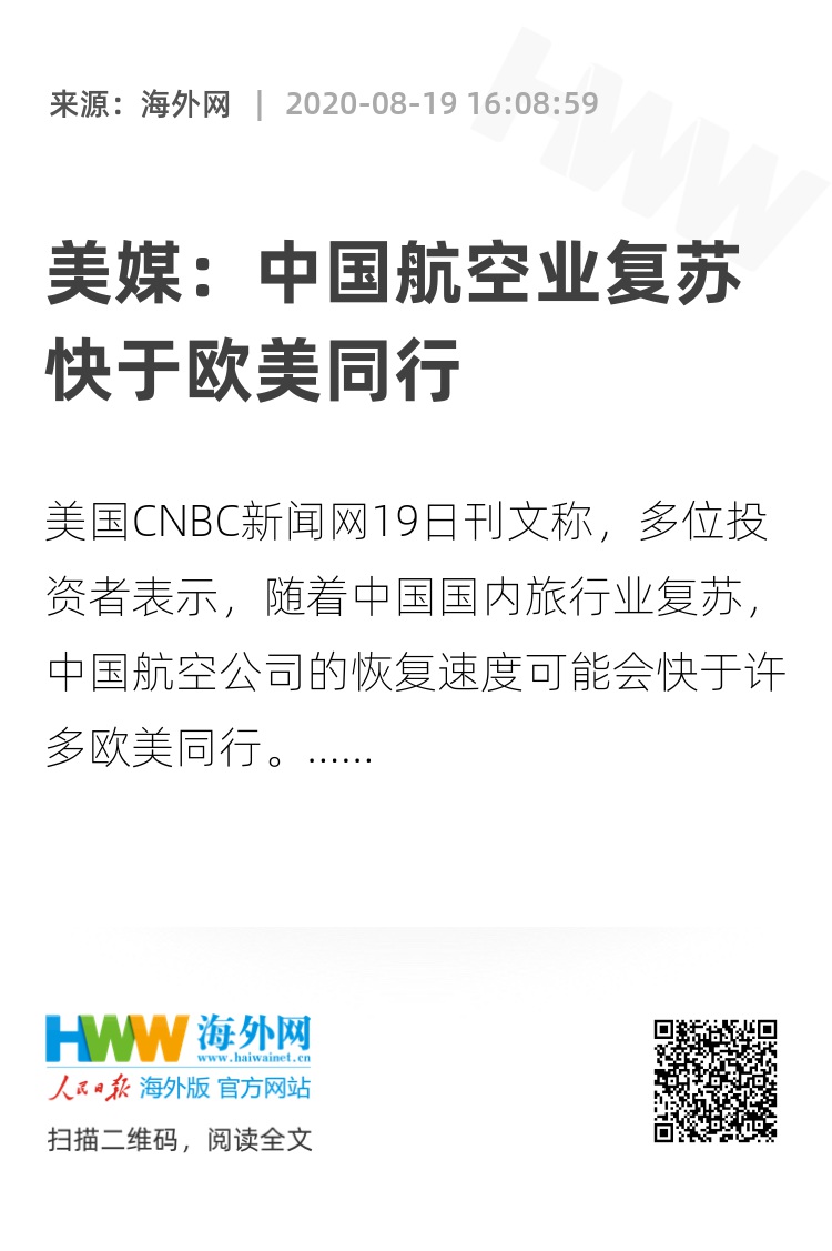海外网8月19日电 美国CNBC新闻网19日刊文称,多位投资者表示,随着中国国内旅行业复苏,中国航空公司的恢复速度可能会快于许多欧美同行。