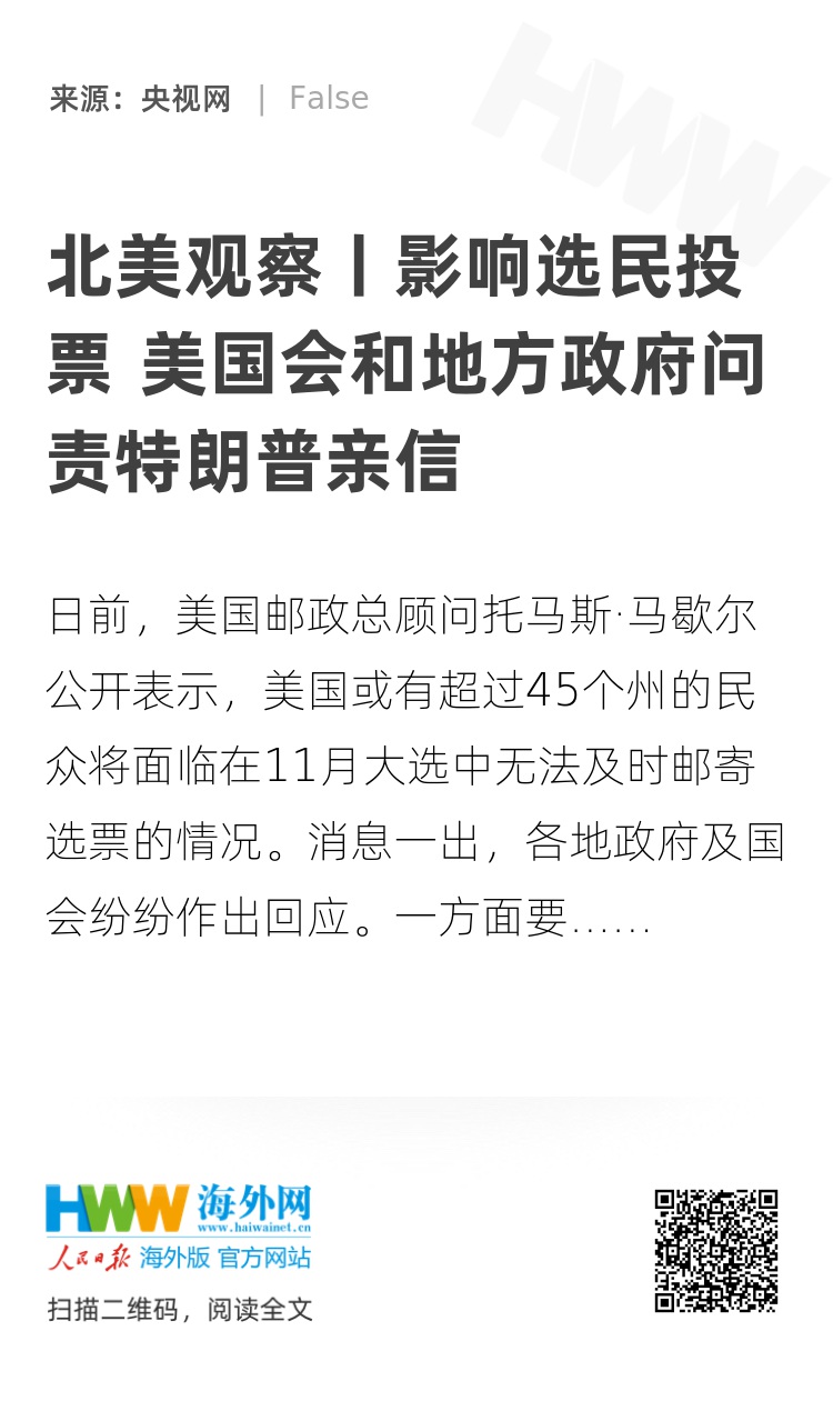 △《纽约时报》报道,邮政总顾问托马斯·马歇尔近日表示,美国或有超过45个州的民众将面临11月大选中无法及时邮寄选票的情况