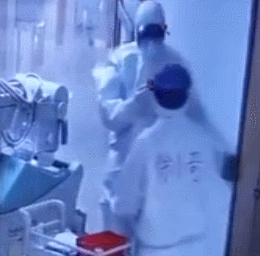 △在浙江绍兴市人民医院隔离病房,护士徐小奇和医生丈夫在走廊相遇。