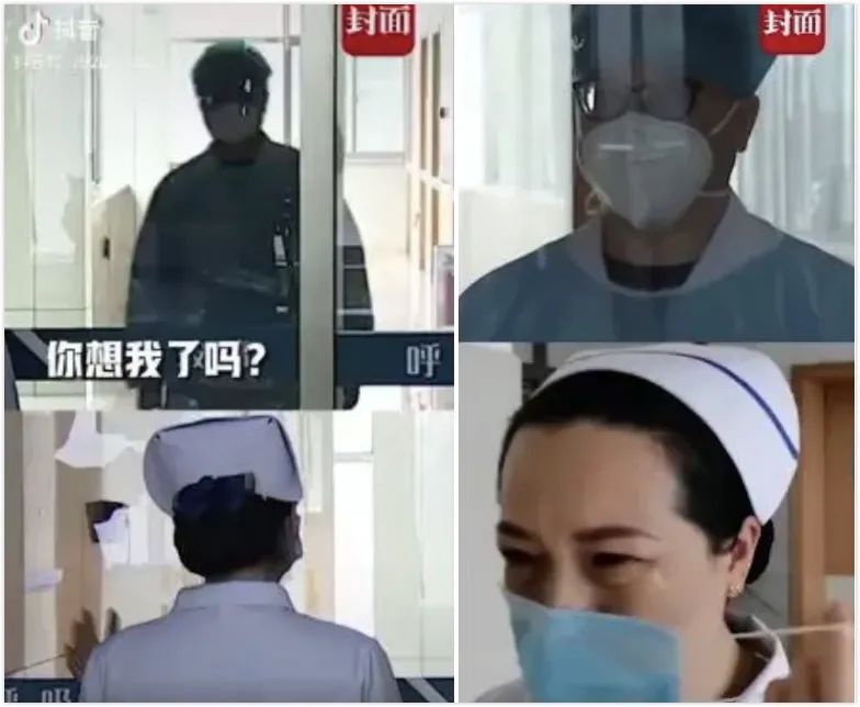 △山东德州第二人民医院呼吸科医生柏玉明与护士妻子在隔离病房门外“约会”。