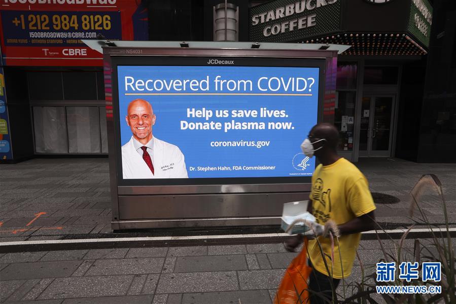 8月19日,在美国纽约,一名行人从号召新冠康复者捐献血浆的广告牌旁走过。 美国约翰斯·霍普金斯大学19日发布的新冠疫情最新统计数据显示,美国累计确诊病例已超过550万例。数据显示,截至美国东部时间19日13时27分(北京时间20日1时27分),美国累计确诊病例5505074例,累计死亡病例172418例。 新华社记者 王迎 摄