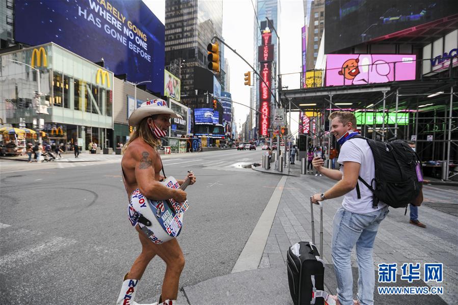 8月19日,一名扮成牛仔的街头表演者在美国纽约时报广场与游客互动。 美国约翰斯·霍普金斯大学19日发布的新冠疫情最新统计数据显示,美国累计确诊病例已超过550万例。数据显示,截至美国东部时间19日13时27分(北京时间20日1时27分),美国累计确诊病例5505074例,累计死亡病例172418例。 新华社记者 王迎 摄