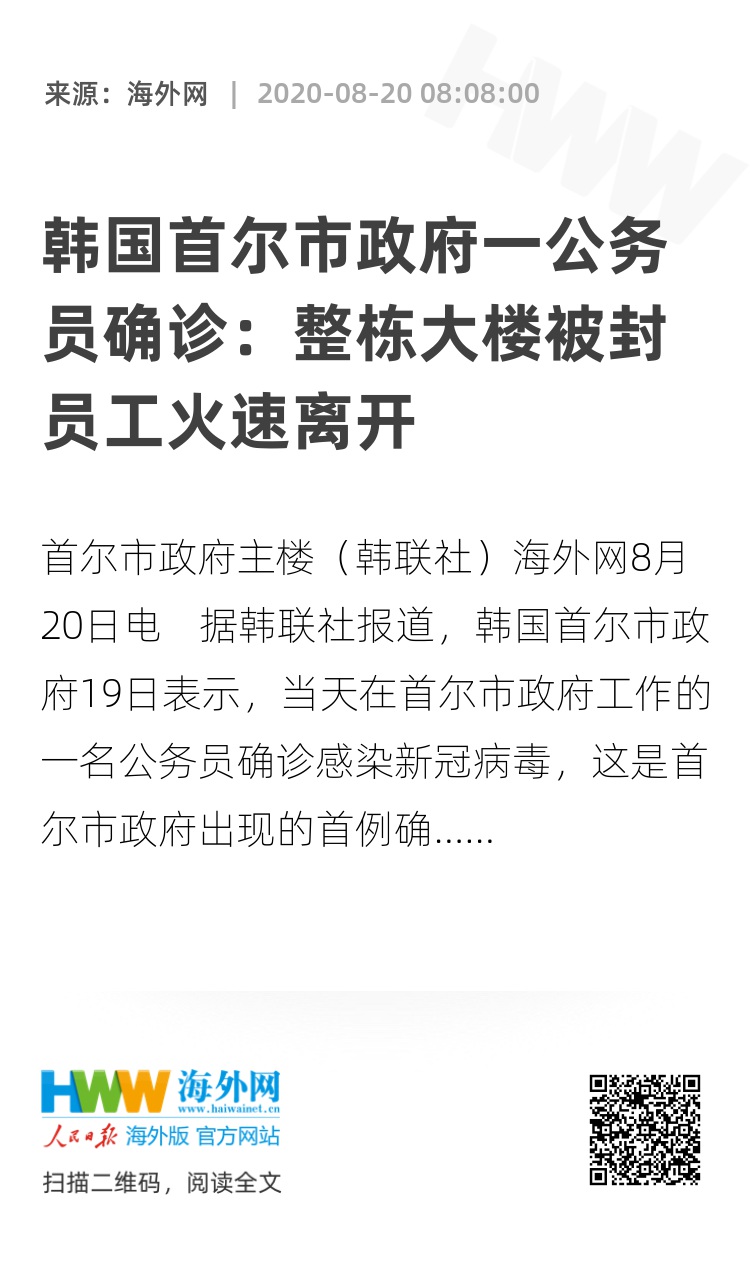 海外网8月20日电 据韩联社报道,韩国首尔市政府19日表示,当天在首尔市政府工作的一名公务员确诊感染新冠病毒,这是首尔市政府出现的首例确诊病例。