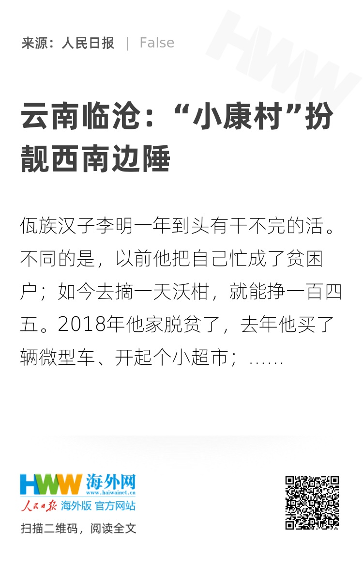 佤族汉子李明一年到头有干不完的活。不同的是,以前他把自己忙成了贫困户;如今去摘一天沃柑,就能挣一百四五。2018年他家脱贫了,去年他买了辆微型车、开起个小超市;今年他准备把三万元贷款还清。他告诉记者:“从脱贫到建小康村,没有政策、环境大变化,光靠自己辛苦难过上好日子。”