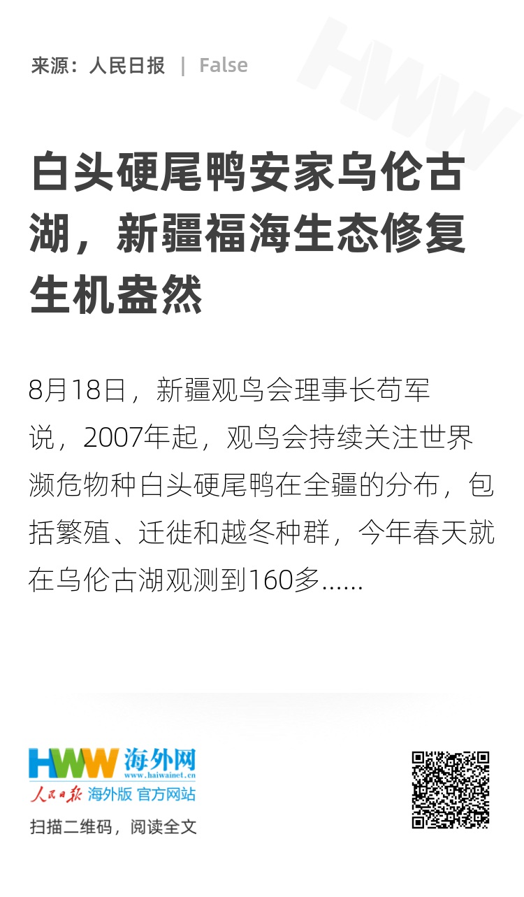8月18日,新疆观鸟会理事长苟军说,2007年起,观鸟会持续关注世界濒危物种白头硬尾鸭在全疆的分布,包括繁殖、迁徙和越冬种群,今年春天就在乌伦古湖观测到160多只,是目前发现最多的种群。