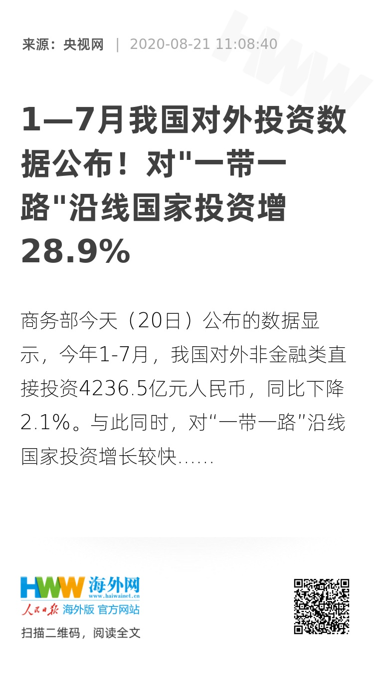 商务部今天(20日)公布的数据显示,今年1-7月,我国对外非金融类直接投资4236.5亿元人民币,同比下降2.1%。与此同时,对“一带一路”沿线国家投资增长较快。