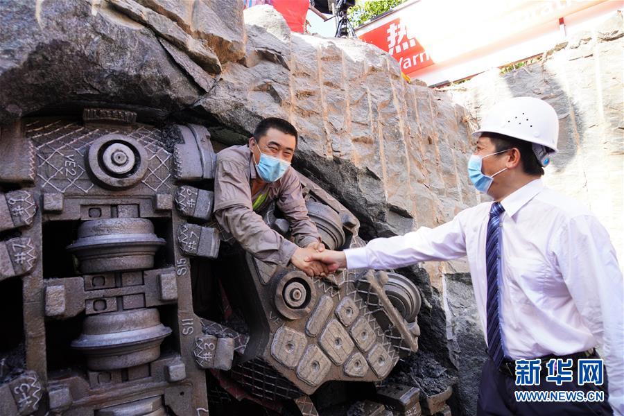 8月21日,斯里兰卡首都科伦坡北部地下排水项目新穆特瓦尔工程盾构隧道全线贯通后,中国企业项目经理与隧道另一侧的盾构机中方操作人员握手。 由中国企业承建的科伦坡北部地下排水项目新穆特瓦尔工程盾构隧道21日全线贯通。 新华社记者唐璐摄