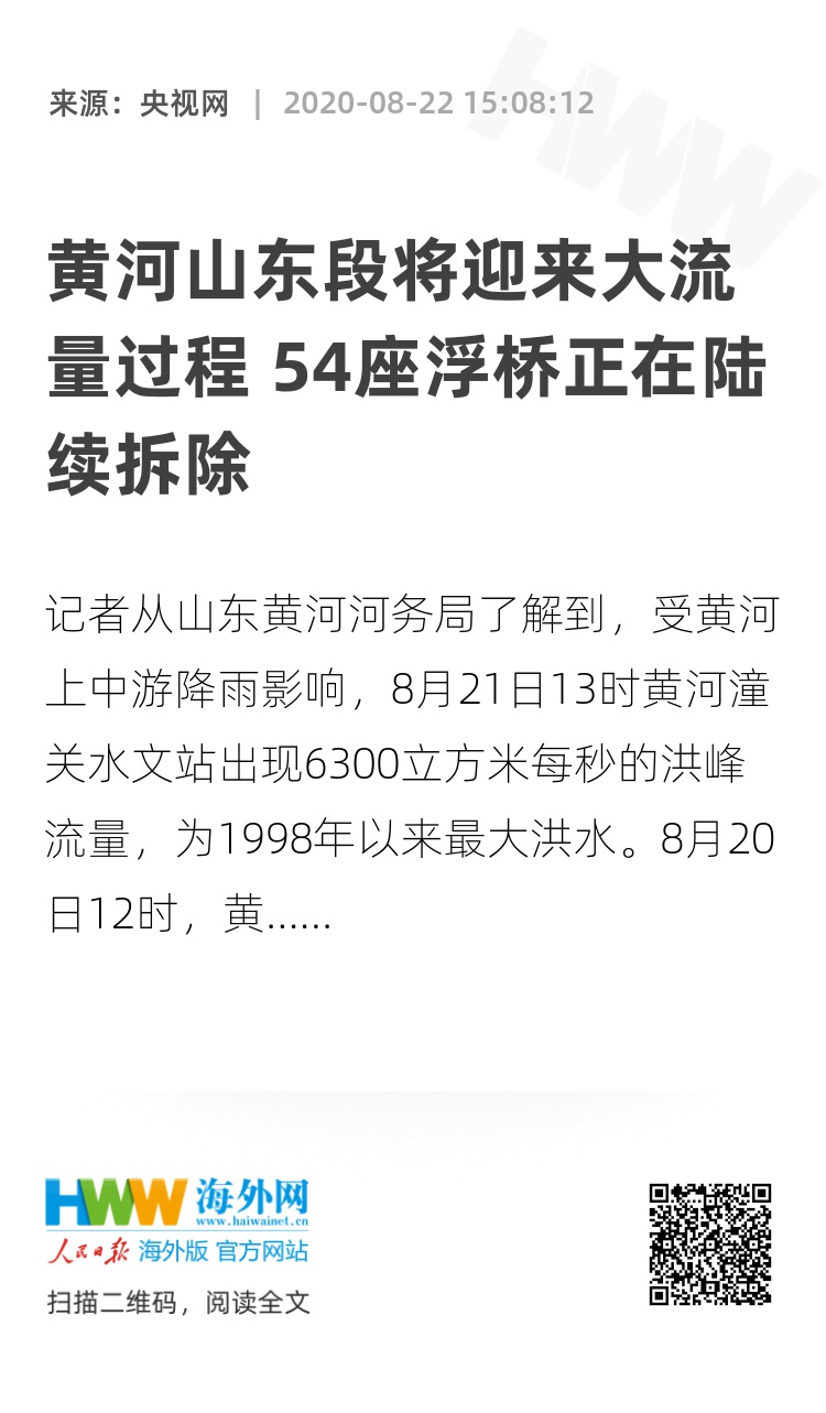 21日上午,山东省防指印发《关于做好黄河及东平湖洪水防御工作的紧急通知》,要求立即按照规定启动防御大洪水工作机制,全面布置防汛力量,落实浮桥监管责任,按规定拆除浮桥,目前山东境内54座黄河浮桥正在陆续拆除。(总台央视记者 窦效磊)