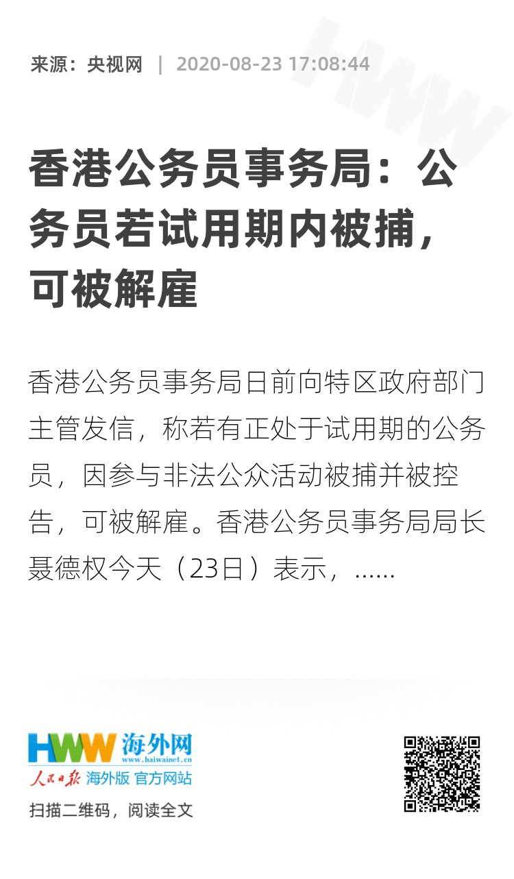 香港公务员事务局日前向特区政府部门主管发信,称若有正处于试用期的公务员,因参与非法公众活动被捕并被控告,可被解雇。