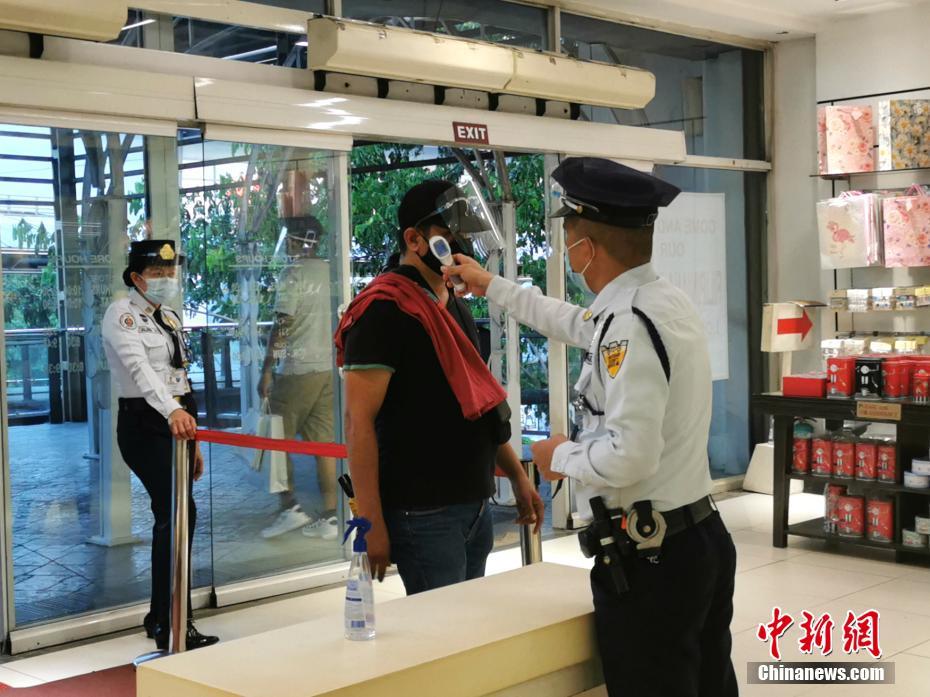 8月22日,马尼拉CBD马卡蒂LANDMAK商场,保安为戴面罩的顾客量体温。菲律宾新发传染病管理跨机构工作组要求,人们在公共交通、工作场所,以及所有封闭的场所,均须戴面罩。 中新社记者 关向东 摄