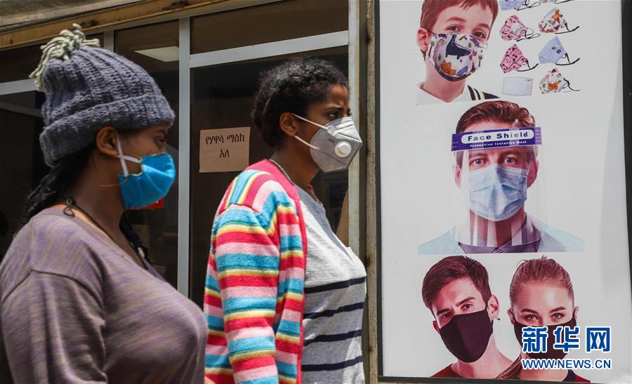 8月21日,行人在埃塞俄比亚首都亚的斯亚贝巴街头经过防疫宣传广告牌。新华社发(迈克尔·特韦尔德摄)