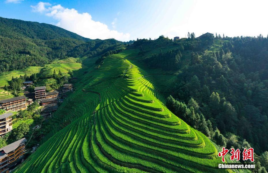 处暑时节,广西桂林市龙胜各族自治县龙脊梯田绿意盎然,放眼望去,层层叠叠的梯田绿波荡漾,美不胜收,游客徜徉在满目翠绿的梯田之间放松心情、乐享假期。潘志祥 摄