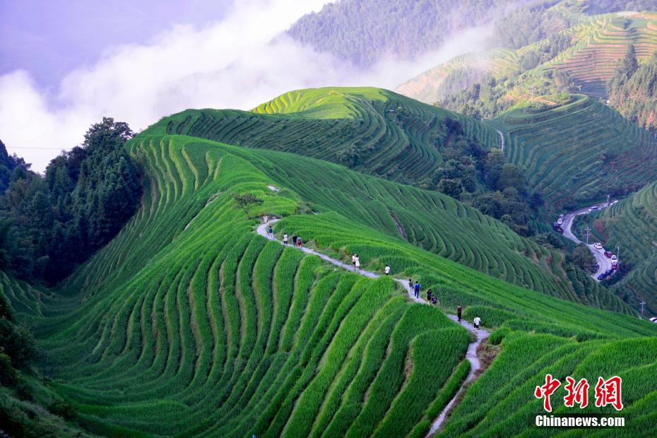 处暑时节,广西桂林市龙胜各族自治县龙脊梯田绿意盎然,放眼望去,层层叠叠的梯田绿波荡漾,美不胜收,游客徜徉在满目翠绿的梯田之间放松心情、乐享假期。潘志祥 摄