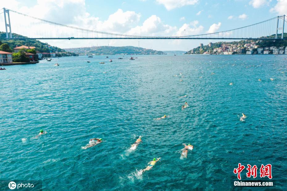 当地时间8月23日,土耳其伊斯坦布尔,第32届博斯普鲁斯海峡洲际跨海游泳比赛举行,参赛者横越博斯普鲁斯海峡,从亚洲游到欧洲。图片来源:ICphoto