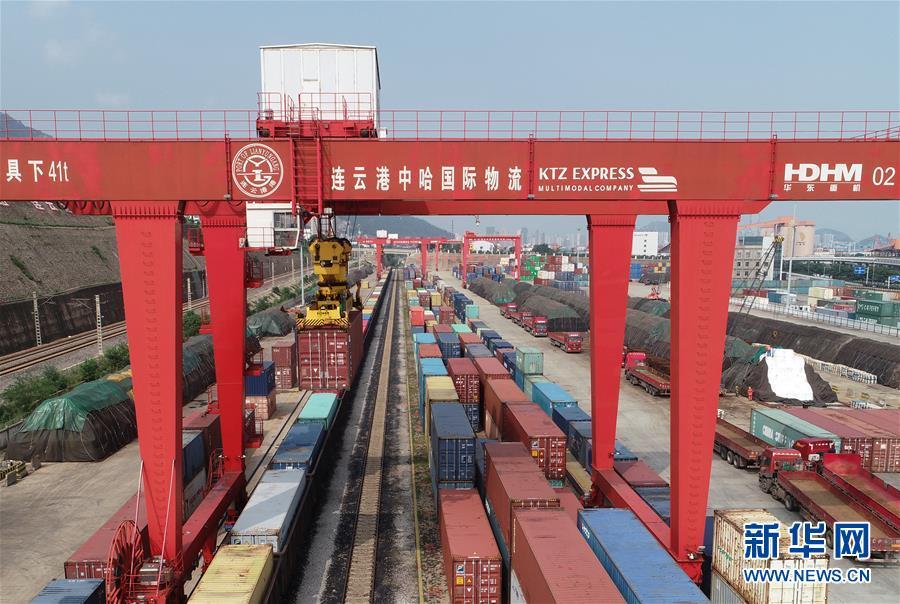 8月23日,在位于江苏连云港的中哈(连云港)物流合作基地,大型机械在装载货物。 统计显示,1至7月,连云港中欧班列实现大幅增长,累计开行中欧班列370列,同比增长43.97%。 今年以来,尽管面对新冠肺炎疫情的巨大压力,多地中欧班列的开行数量均实现逆势大幅增长,为畅通国际物流通道提供了有力支撑。 新华社发(王健民 摄)