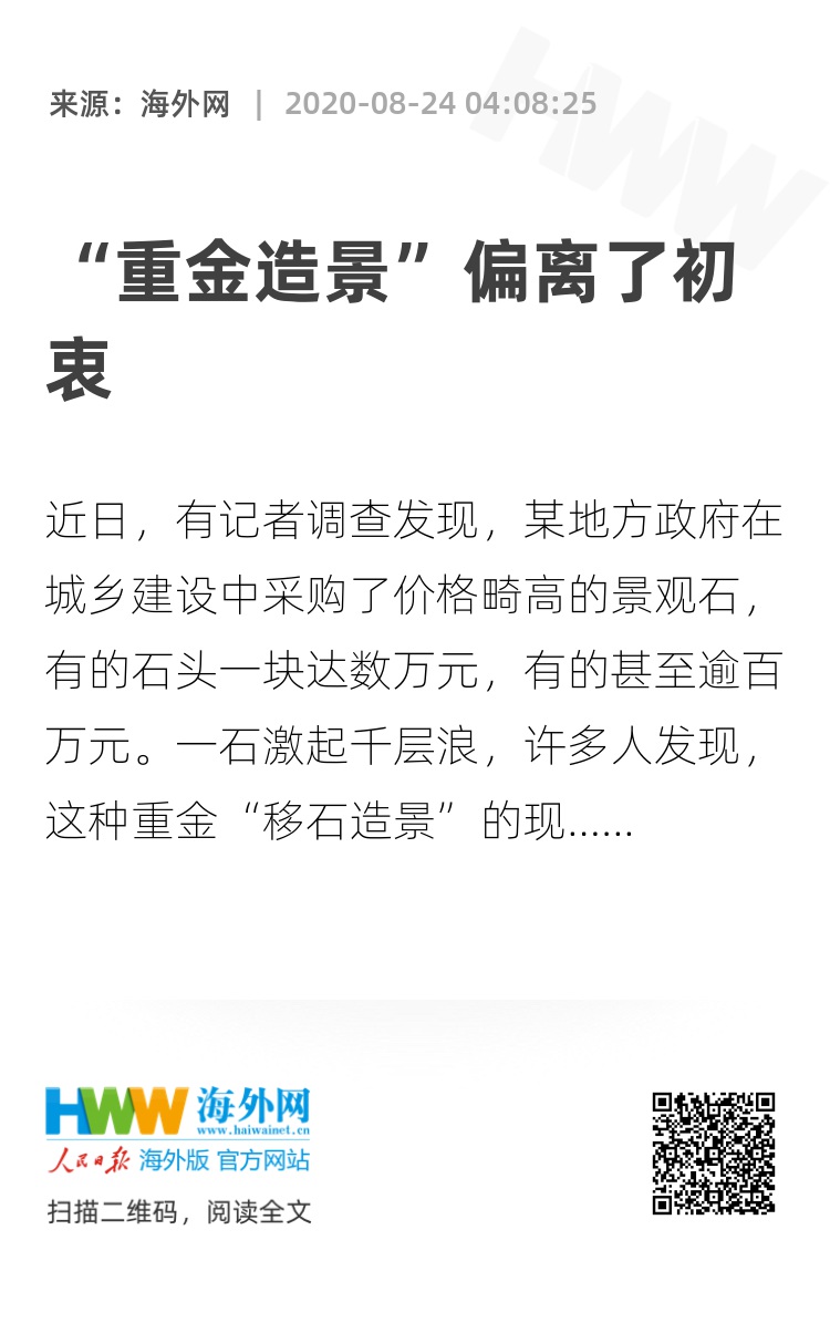 近日,有记者调查发现,某地方政府在城乡建设中采购了价格畸高的景观石,有的石头一块达数万元,有的甚至逾百万元。一石激起千层浪,许多人发现,这种重金“移石造景”的现象并非孤例,在城市绿化带、公园、景区和广场等场所,都有这些名贵石头的身影。