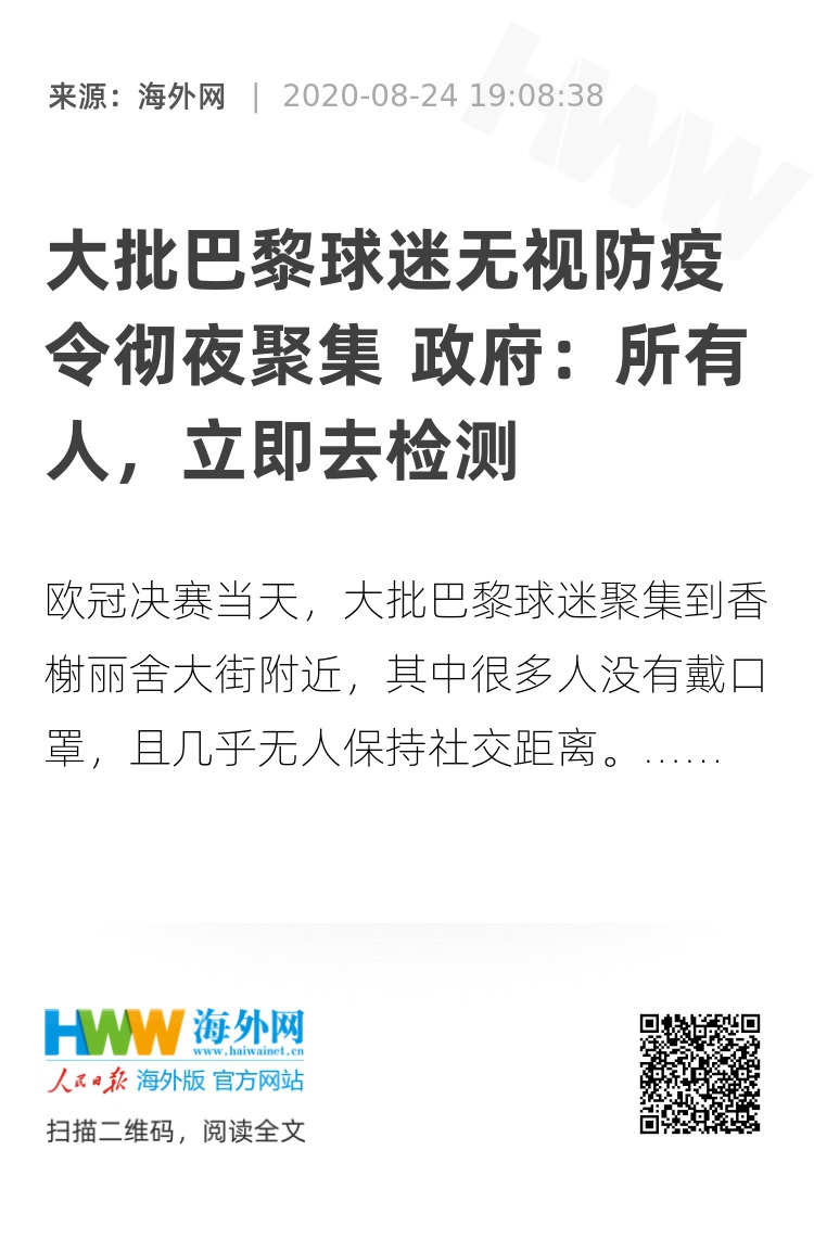 海外网8月24日电 欧洲冠军联赛决赛23日晚在里斯本举行,赛后大批巴黎球迷聚集到香榭丽舍大街附近,其中很多人没有戴口罩,且几乎无人保持社交距离。该事态引发了巴黎市政府的担忧,副市长苏西24日要求所有参与聚集的球迷立即接受新冠病毒检测。
