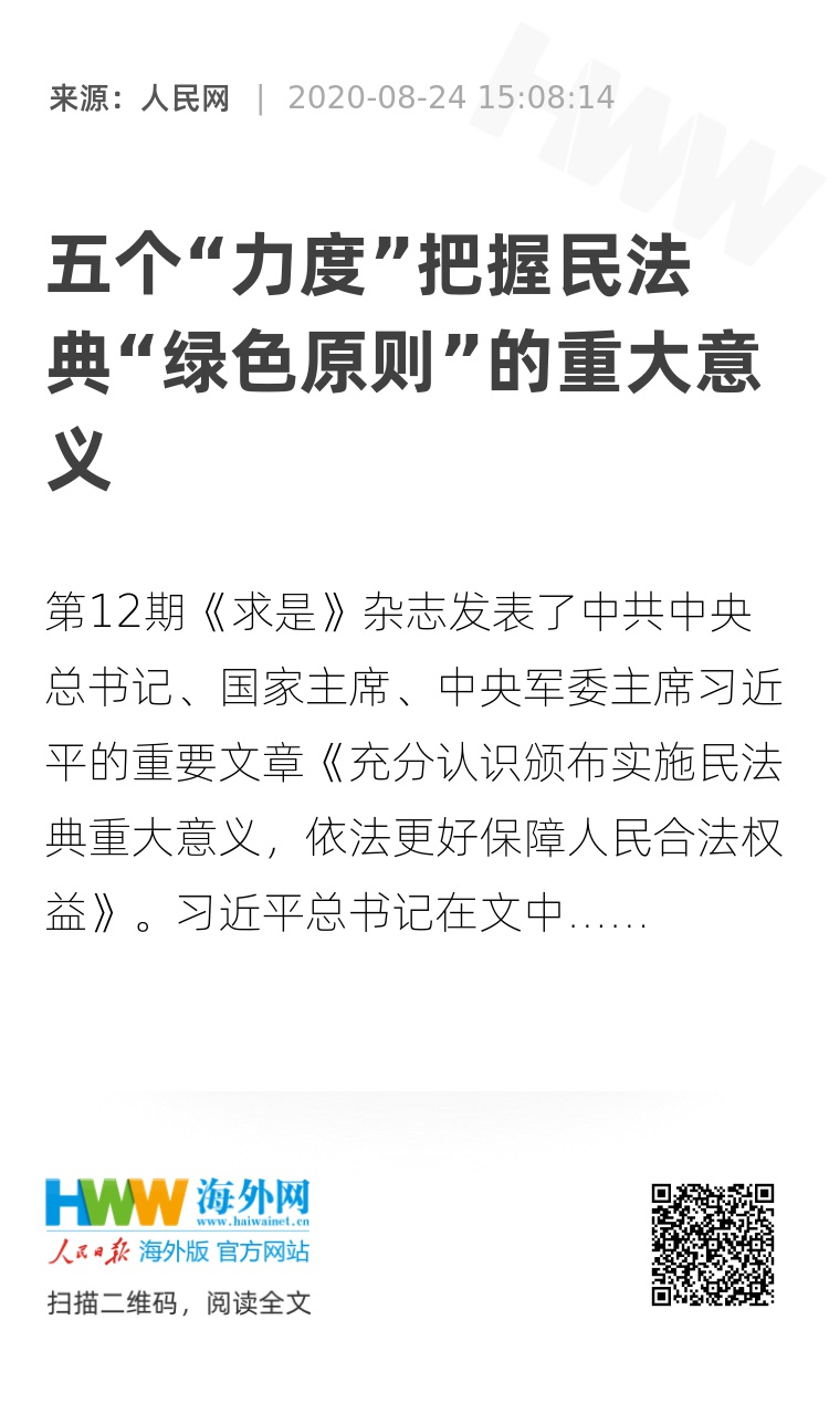 第12期《求是》杂志发表了中共中央总书记、国家主席、中央军委主席习近平的重要文章《充分认识颁布实施民法典重大意义,依法更好保障人民合法权益》。习近平总书记在文中强调,“民法典在中国特色社会主义法律体系中具有重要地位,是一部固根本、稳预期、利长远的基础性法律”。深入学习贯彻习近平总书记重要讲话精神,深刻领会并自觉践行习近平生态文明思想,需要我们从保障力度、基础力度、抓手力度、关键力度、底线力度等五个“力度”来理解民法典“绿色原则”的重大意义与时代价值。