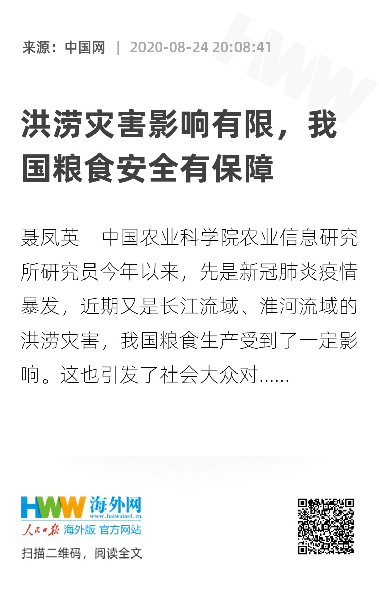 今年长江流域的洪涝灾害引起关注,特别是对于农业生产的影响。据8月13日的国家防总消息,今年洪涝灾害导致603.26万公顷农作物受灾,其中绝收114.08万公顷,主要集中在长江中下游和淮河地区。而2019年全国粮食播种面积达到11606.4万公顷,受灾面积仅占播种面积的很小部分,而且洪水灾害也不可能会导致整体粮食减产。从目前公布的统计数据看,2020年全国夏粮总产量14281万吨,比2019年增长0.9%;早稻总产量2729万吨,比2019年增长3.9%。目前的基础很好,从全年粮食生产来看,秋粮占全年粮食产量的70%以上,从生产区域来看,60%的秋粮在北方地区,受洪涝影响相对较小。而在长江中下游等受灾地区,得益于近些年的经济发展和科技进步,通过各项救灾措施,加强种植管理,洪涝灾害的影响是可以降到最低的。
