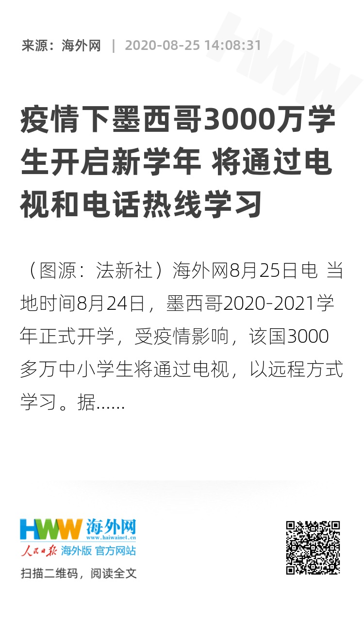 海外网8月25日电 当地时间8月24日,墨西哥2020-2021学年正式开学,受疫情影响,该国3000多万中小学生将通过电视,以远程方式学习。