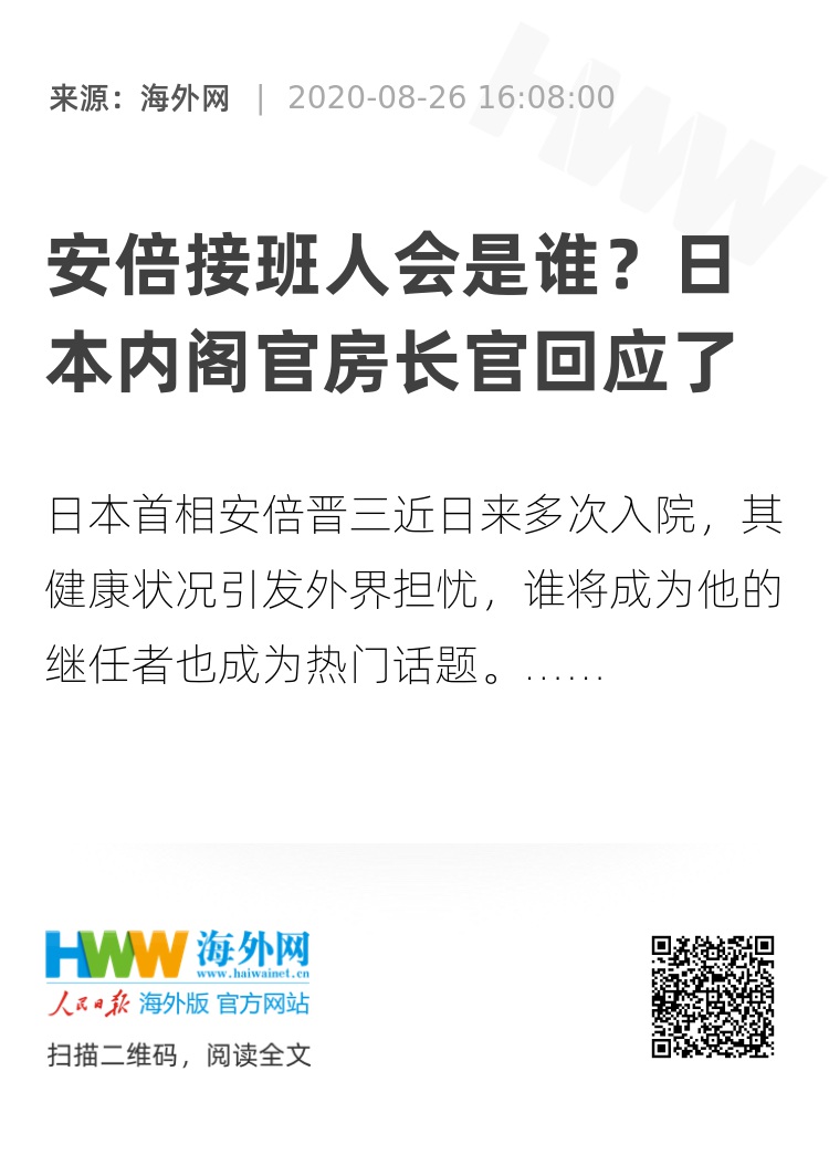 海外网8月26日电 日本首相安倍晋三近日来多次入院,其健康状况引发外界担忧,谁将成为他的继任者也成为热门话题。对此,日本内阁官房长官菅义伟26日正式回应称,“安倍的任期还有一年,现在讨论继任者还为时过早”。